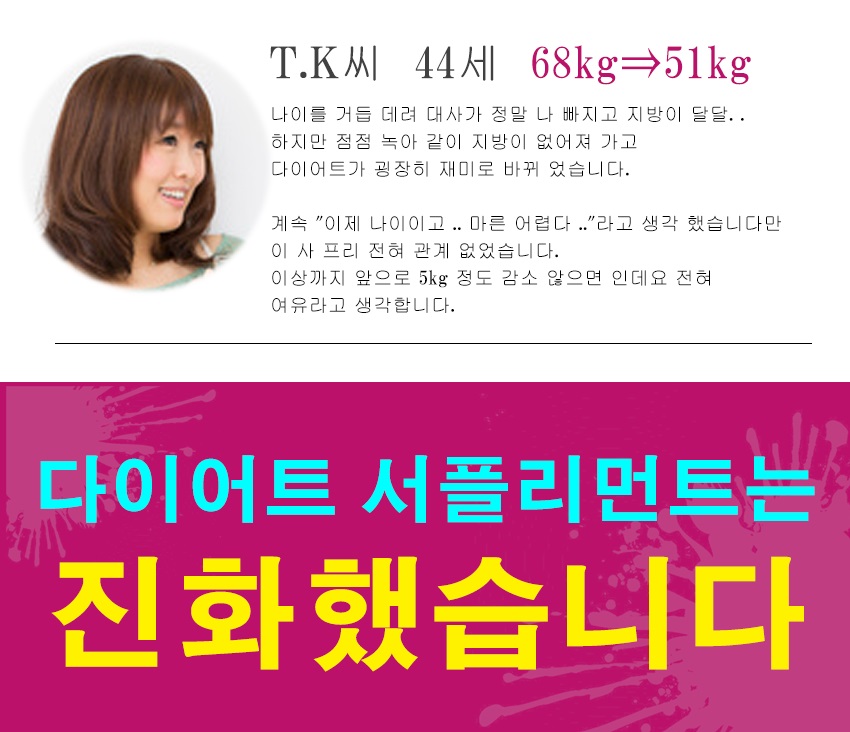 | 성분 | L- 카루 산염, 캄보지아 추출물, 흰 강낭콩 추출물 분말, 귀리 섬유, 생강 말 코엔자임 Q10, 코레 우스 호루스 코리 추출물 분말 / 셀룰로오스, 트레할로스, 뿌루 란, 스테아린산 칼슘, 미립 이산화 규소, 차 추출물, 향료 추출 그들, L- 티로신 |