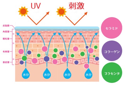 ![]() 紫外線に負けないお肌作りに必須! セラミド、コラーゲン、プラセンタなどのお肌うるおい成分で水分を蓄えバリア機能を向上! 外部刺激を受け付けないコーティング作用を作り出します。 |