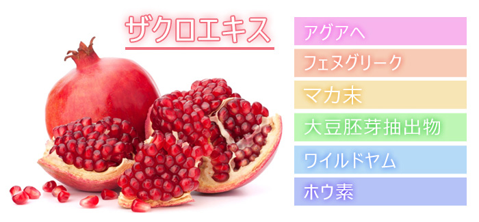 | 原材料名 | ザクロ エキスパウダー(デキストリン、ザクロ果汁)、ア グアヘエキス末、ワイルドヤムエキス末、ホウ素(ボロン)含有酵母、大豆胚芽抽出物、フェヌグリーク種子抽出物、マカ末、フィッシュコラーゲンペプチド(ゼラチンを含む)、コエンザイムQ10、植物プラセンタ(メロン胎座抽出物、デキストリン) / セルロース、ステアリン酸カルシウム、微粒酸化ケイ素、ビタミンC、ビタミンE、ナイアシン、パントテン酸Ca、ビタミンB2、ビタミンB1、ビタミンB6、ビタミンA、葉酸、ビタミンD、ビタミンB12 |