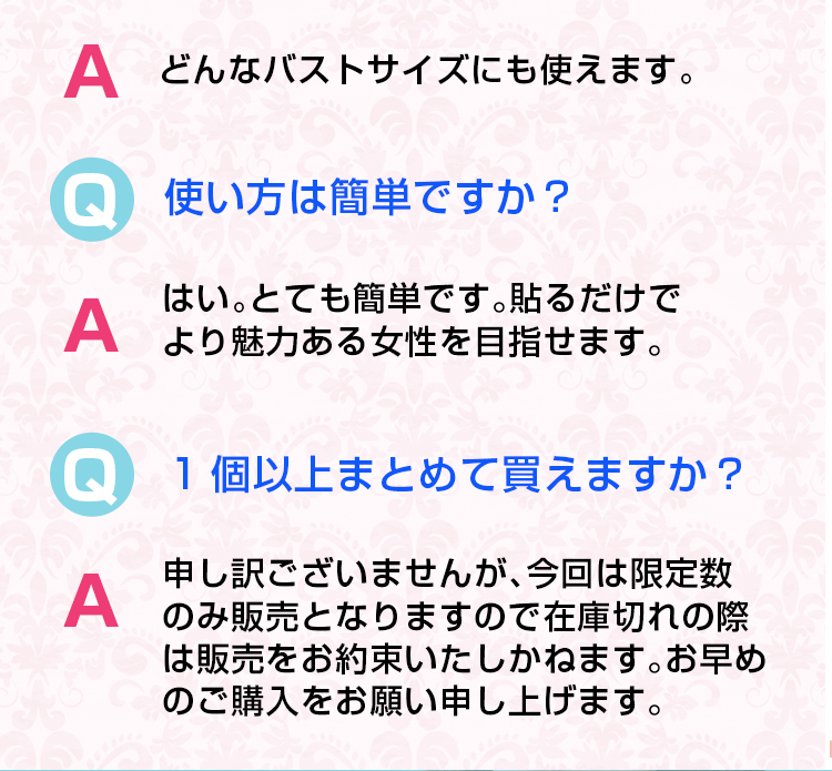| ご使用方法 | ●軽くシールを押さえながら直接肌に貼り付けてください。(バスト外側部分)●本品を貼る際には、はがれない ようしっかりと貼ってください。 |