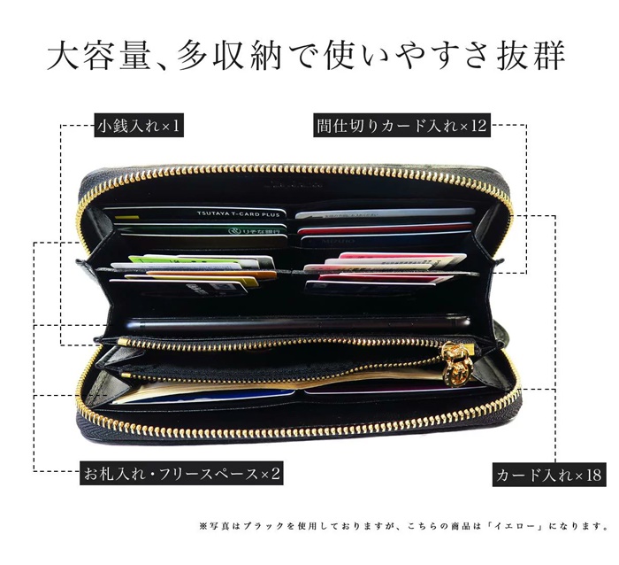 | 仕様 | ラウンドファスナー開閉,小銭入れ×1,札入れ×3,カード入れ×24,ポケット×3 |