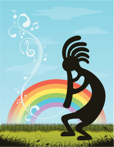 | ココペリは、幸せと成功、出会いを運ぶ、アメリカ先住民族「インディアン」の精霊であり、神的存在。猫背で笛を吹く様子で描かれることが多く、アニミズムの信仰により様々なインディアンによって古来から崇拝されてきました。 「ココペリが笛を吹くと、地面から緑が吹き出し、花が咲き乱れ、木々は生い繁り、動物たちは次々と子供を産み落とす。豊作・子宝・幸運をもたらす豊穣の神。」といわれています。 |