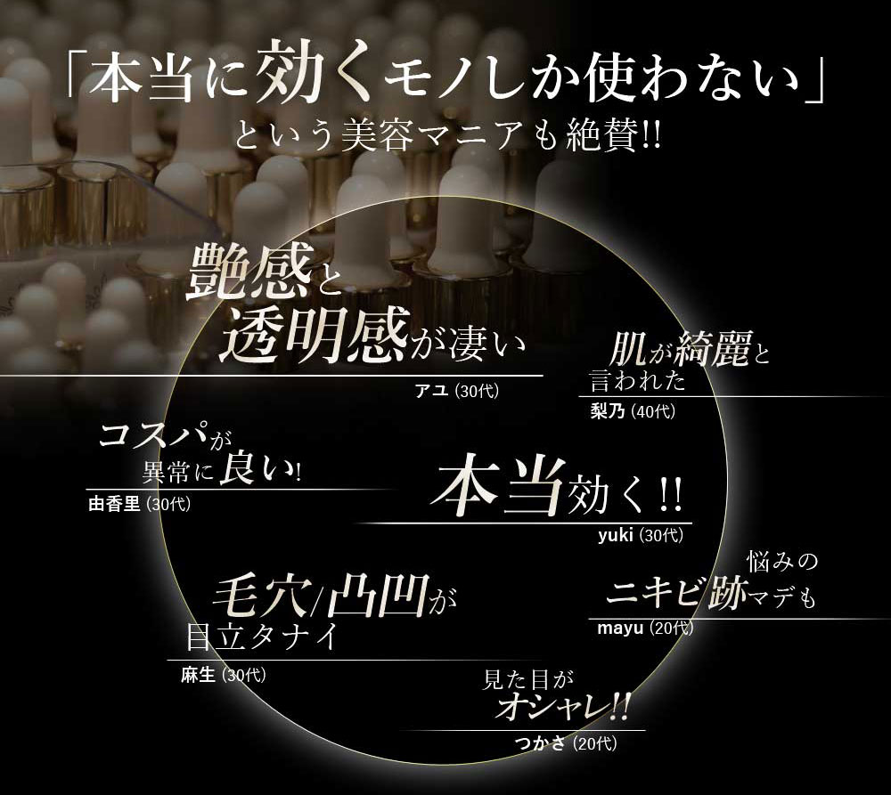 □シワのないピンっ!とハリのあるモチモチ肌 □若々しい輪郭へ引き上げ □繊細なキメ肌 □カサツキがなくふっくらとした皮膚感 □活発感のあるフレッシュな目元 □笑顔が素敵な引き上がった口元・ホウレイ線 □黒点・古い角質層によるクスミを取り除き、透き通るような雪肌感 |