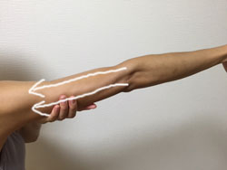 @腕の角度を約30度に伸ばし、脇の下に向かって腕をさすって脂肪を流すようにマッサージをする。