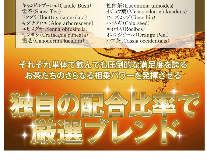 | 全成分 | キャンドルブッシュ、杜仲、どくだみ、雪茶、キダチアロエ、えびす草、山査子、霊芝、イチョウ葉エキス、ローズヒップ、はと麦、ルイボス、オレンジピール、はぶ草 |
